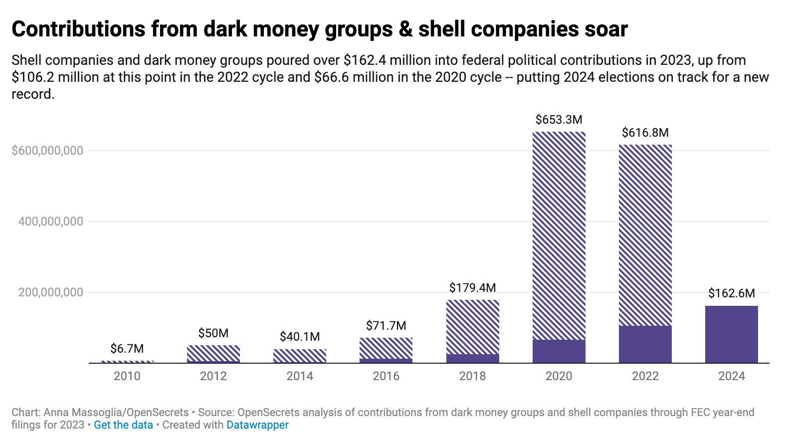 Note the dark money chart (second chart) was published in March 2024 and has only partial data for that year. (Roosevelt Institute, OpenSecrets)