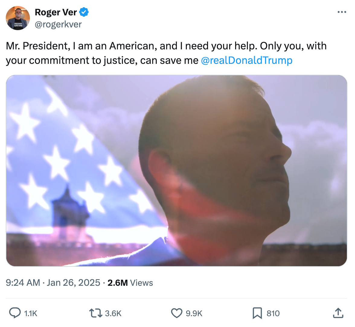 Despite its professed shift, the Trump-era DOJ has been erratic on crypto enforcement. In statements and in select cases — especially those involving wealthy, well-connected players — it has appeared lenient. It dropped an investigation into crypto prediction market platform Polymarket [I89]. It’s looking to settle a major tax evasion case against Roger Ver, a wealthy crypto investor who in January published a video plea to Trump for leniency, complete with waving flags, a dramatized enactment of Ver being arrested, and Ver insisting “I am an American, and I will die an American” (Ver renounced his US citizenship in 2014 in hopes of avoiding taxes on his crypto gains, though he now says it was to escape “lawfare” from the US government) [I57, 91, 95]. The department has also said it won’t prosecute developers who write crypto software “without ill-intent” even if they fail to register as money transmitters.13 And Trump himself rebuked the Biden-era DOJ by pardoning Binance founder Changpeng Zhao, framing relief for a man alleged to have deliberately evaded US regulations to profit from American customers as a stand against a “war on crypto”.