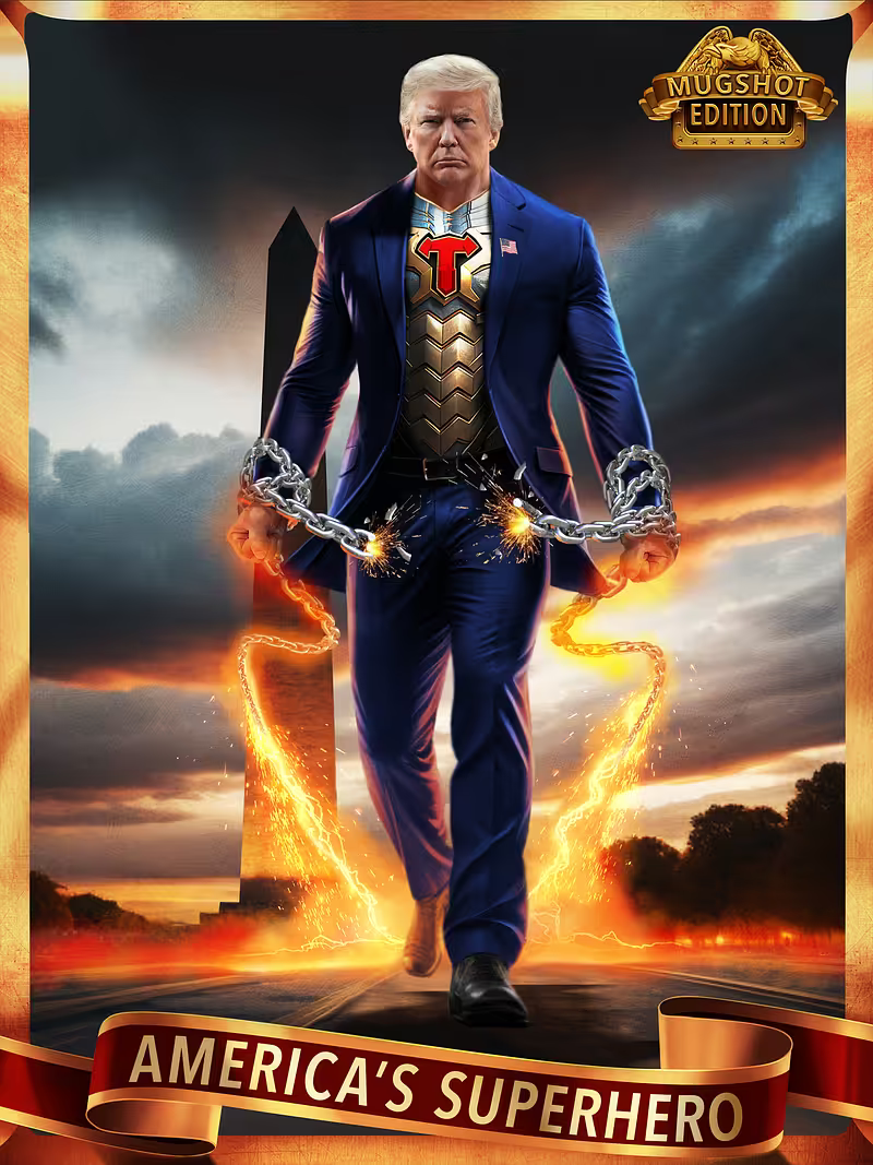 “America’s Superhero” NFT (December 2023), fist-pump illustration for the Trump memecoin (January 2025), memecoin dinner illustration (April 2025), and the Trump Billionaires Club announcement illustration (December 2025)